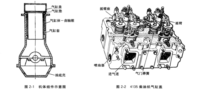 發(fā)電機(jī)機(jī)體組件包括機(jī)體(氣缸體、曲軸箱)、油底殼、氣缸套、氣缸蓋等,見圖2-1? 圖2-3。它是柴油機(jī)的固定機(jī)件,是所有往復(fù)運(yùn)動和回轉(zhuǎn)運(yùn)動機(jī)件的導(dǎo)向件和支承件,承受 不平衡的各種負(fù)荷,并在其相應(yīng)部位安裝各種輔助系統(tǒng)部件。