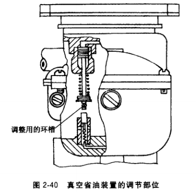 (4) 省油裝置的維修。231型汽化器裝有真空省油裝置和機(jī)械省油裝罝。真空省油裝置靠真空控制,可借活塞杠桿下端3道環(huán)梢加以調(diào)節(jié),如圖2-40所示。向下調(diào)節(jié)一個(gè)環(huán)槽,