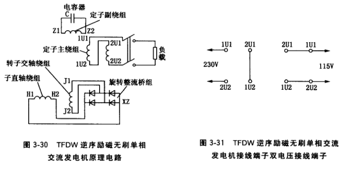 圖3-30為國產TFWD系列隱極式逆序勵磁無刷單相交流發電機整機原理電路圖, 圖3-31為其接線端子。該系列定子主繞組由兩個完全相同的繞組連接而成,每個繞組頭尾線端標志分別為1U1、1U2和2U1、2U2。兩個繞組不同接法時輸出電壓可為230V或 115V:用接線片連接端子1U2、2U1時,表示主繞組1尾端和主繞組2的頭端連接,此時兩個繞組串聯,輸出電壓為230V;用接線片分別連接1U1、2U1, 1U2、2U2,兩個繞組頭頭連接、尾尾連接,此時兩個繞組并聯,輸出電壓為115V。