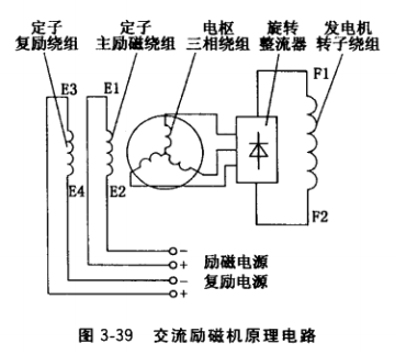 交流勵磁機的原理電路如圖3-39所示。交流勵磁機電樞與發電機轉子同軸安裝,由內燃機驅動發電機轉子旋轉至空載轉速,依靠交流勵磁機定子鐵心剩磁磁場,電樞繞組感應三相交流電,經旋轉整流器整流成直流電,輸入發電機轉子磁極繞組,增強轉子主磁場,提高發電機定子主繞組或副繞組電壓。該電壓作為交流勵磁機的勵磁電源,增大交流勵磁機定子繞組電流(交流勵磁機勵磁電流),電樞繞組感應的三相交流電壓迅速提高,以滿足發電機建立額定電壓所需的勵磁電流。