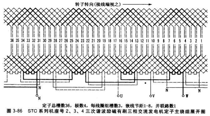 基波副繞組嵌線:按繞組展開圖3-198規定的槽號,把基波副繞組第一個線圈組嵌入8、9、1、2號槽中。該發電機由于基波副繞組分布在4個極上,嵌第2個線圈組時必須反把, 將各線圈邊分別嵌入17、18、10、11號槽(圖3-87例中,基波副繞組只分布在發電機定子 的1、3兩個極,則嵌第2個線圈組時不必反把)。接著第3個線圈組嵌線順序同第1線圈 組,第4個線圈組同第2個線圈組直至完成全部嵌線。