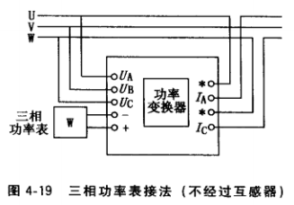 (3)接入三相功率表的三相電壓和電流均經互感器,再接至功率變換器.如圖4-21所 示。這種接法只要配上不同變比的電壓、電流互感器,可測任何電壓、電流下的功率。