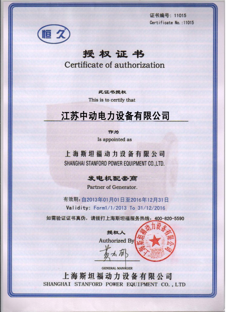 上海斯坦福動力設備有限公司授權江蘇中動電力設備有限公司作為發電機配套商